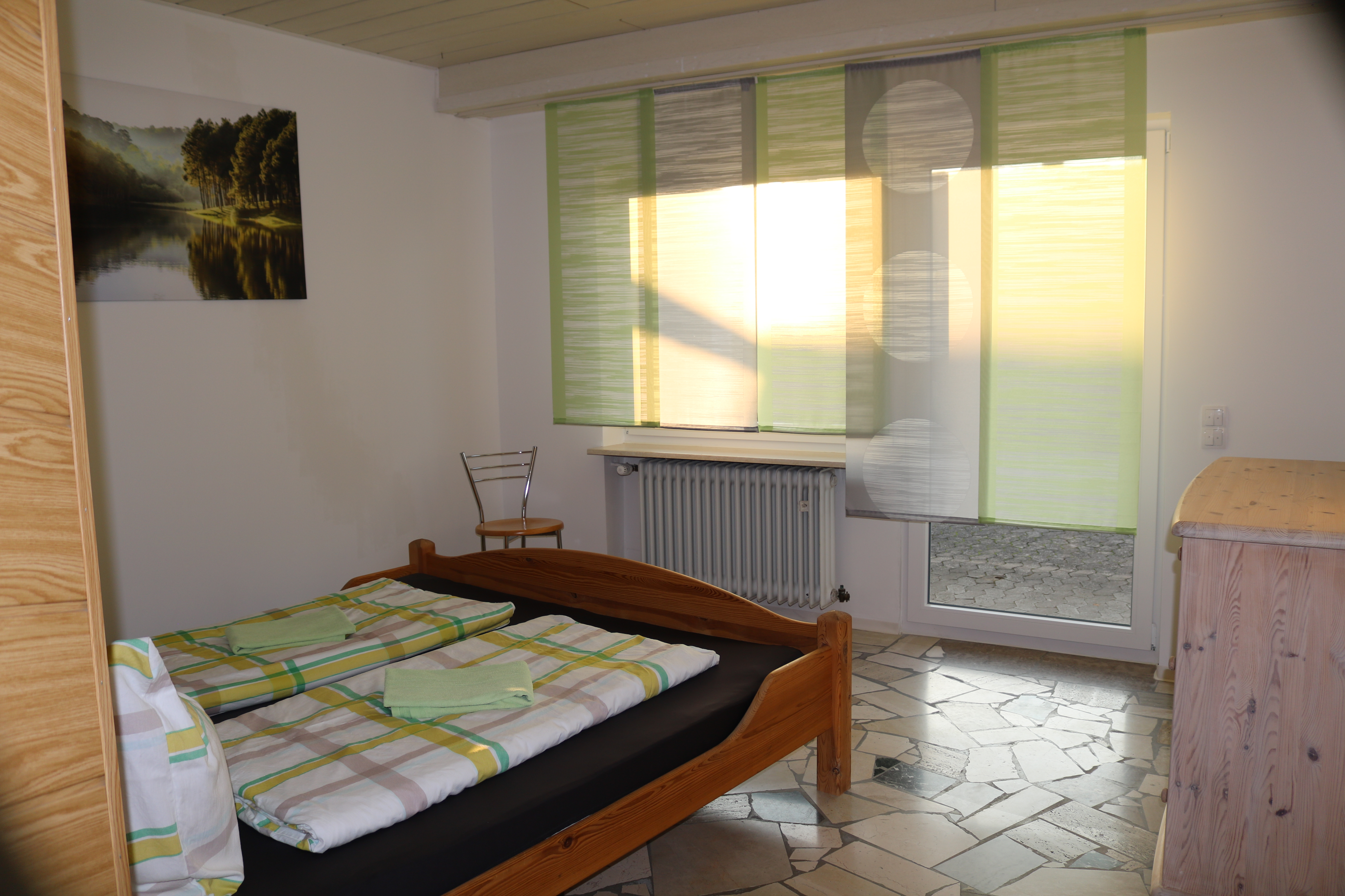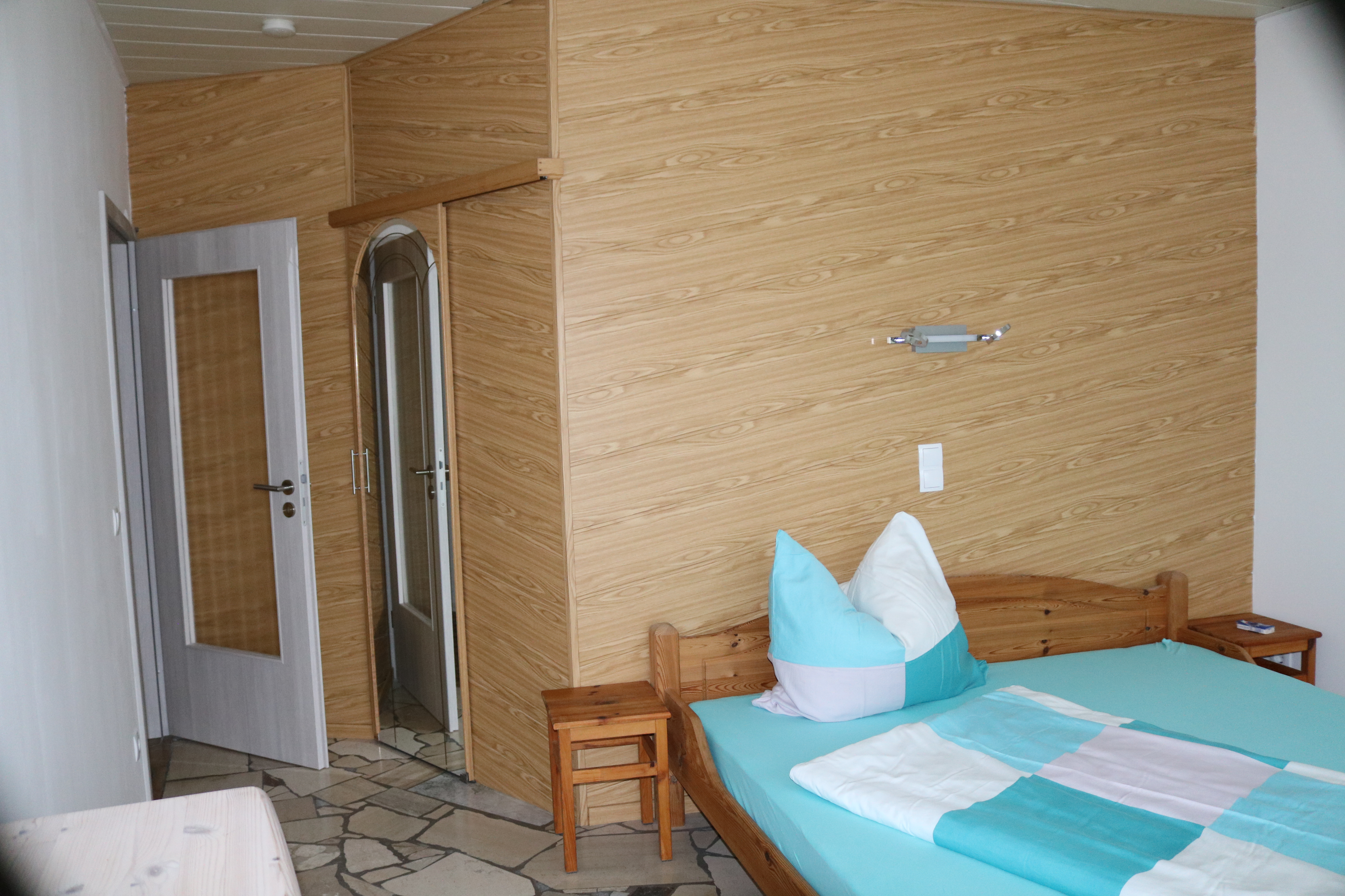 Schlafzimmer1 mit Doppelbett und begehbarem Kleiderschrank. Bei Bedarf kann ein Kinderreisebett zugestellt werden.